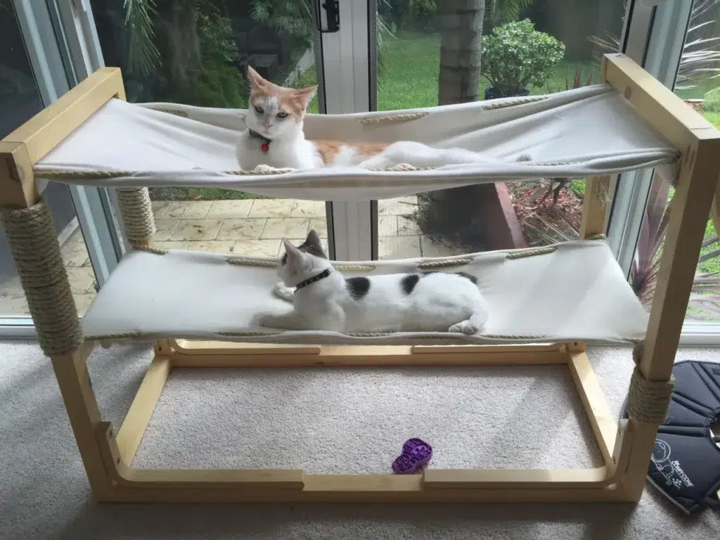 If you have wood and fabric left over from another project, this hammock bunk bed is a great way to use such materials. It has a modern, sleek-looking design that can give your décor a stylish flair and your cats plenty of space for themselves.