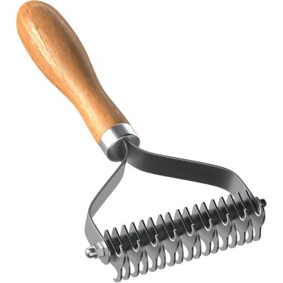 - De-matting Rake: A de-matting rake or undercoat rake is a rake-shaped device that has large teeth that are usually curved. It is designed to get through the top layer of the coat to the undercoat, which regular brushes can miss. The curved teeth are also efficient at de-matting knotted hair.