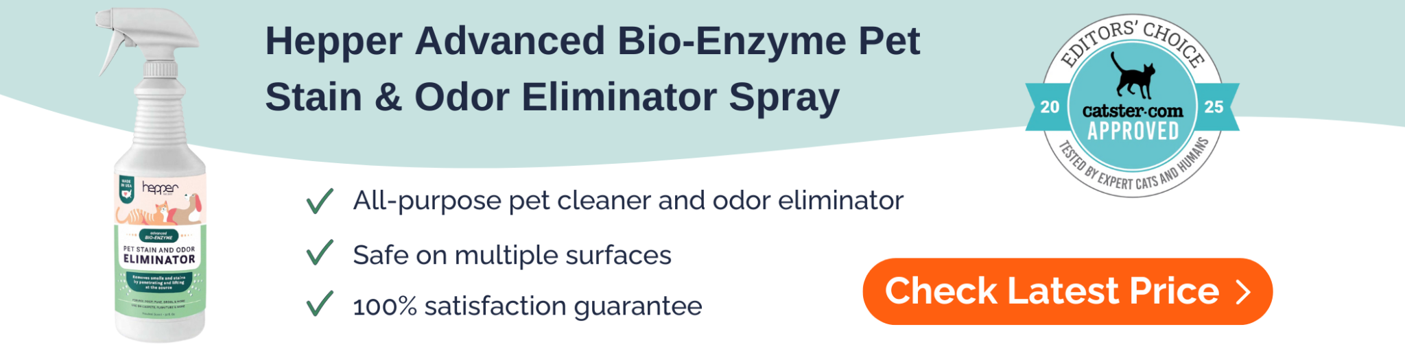 It’s always important to use cleaning products that are not only safe for cats, but that will kill germs and prevent any spread of illness to other pets in your home or to you. At Catster, we have tested all of the cleaning sprays out there, and our favorite is the Hepper Bio-Enzymatic Pet Stain & Odor Eliminator.