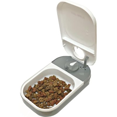 The PetSafe Automatic Meal Feeder holds enough food for two meals and can be set with a delay of up to 24 hours. Each bowl has its own timer, enabling you to offer food for the day, while you’re out. Unlike the digital feeder above, this is a mechanical timer and allows half-hour increments. The bowls are BPA-free plastic, can be removed from the base, and are dishwasher safe. The bowl lids are described as being tamper-proof, which should prevent gluttonous cats from being able to pry the lid open and helping themselves. The two-meal feeder is reasonably priced.