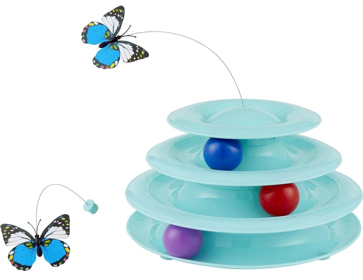 The Frisco Cat Tracks Butterfly Cat Toy is another best cat toy for cats home alone on our list that will amuse your cat. This one has three rings with balls that she can bat inside of them, with each one moving independently of the others. The premise is clever. It also includes two butterfly attachments for the top of the toy. We thought they got more in the way of the rest of it. They were also a bit flimsy.