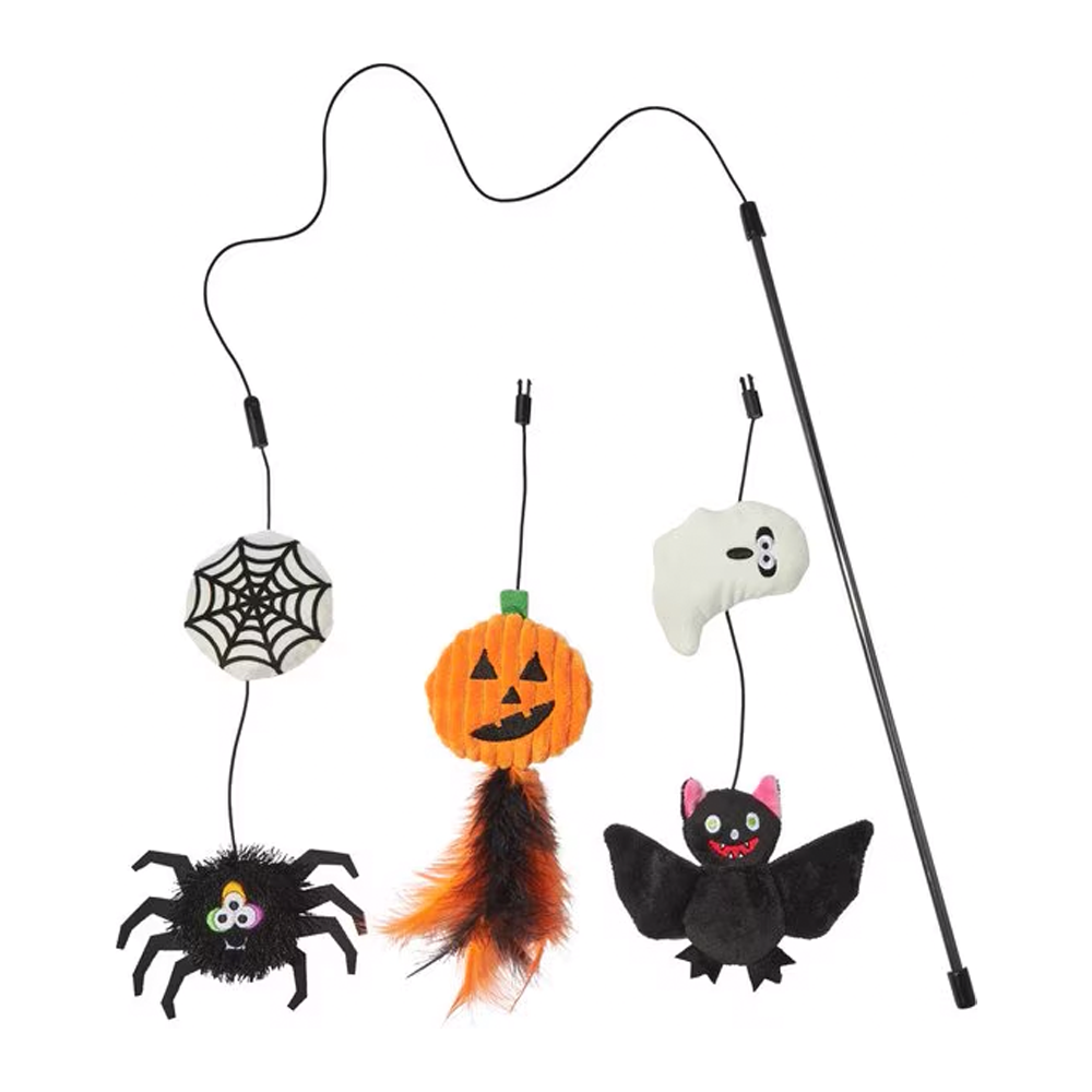For kittens celebrating their first Halloween, the Frisco Halloween Teaser Wand Cat Toy is the top pick. This teaser wand measures 18 inches long and comes with an attached toy with two plushies. There are two refill toys. One features two plushes, and the other has a pumpkin plush with feathers.