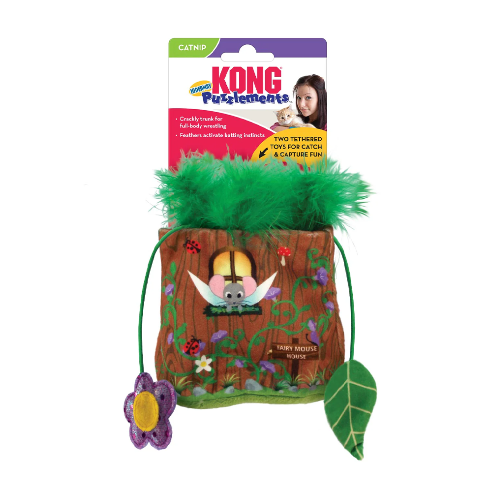 The Kong Halloween Puzzlements Hideaway Dog Toy is an entertaining option for cats that like a challenge with their toys. It features purple feathers on top, as well as two tethered plush toys that can be hidden inside the toy. The toy’s body features crinkle paper, and the tethered toys are stuffed with catnip.