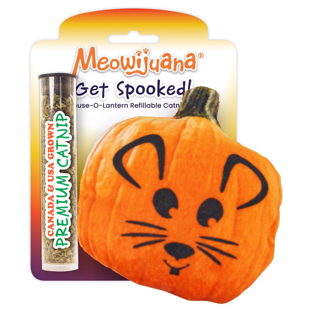 The Meowijuana Get Spooked toy is a cute pumpkin plush cat toy, designed with a refillable pouch of catnip, and even comes with a tube of premium catnip so you can top it up as needed. Meowijuana uses organically grown cantip, known for its potency and purity with no harmful additives, like CBD or THC.