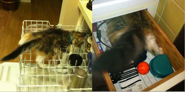 Courtney P‘s cat Daisy loves to investigate the kitchen. Here’s her butt in the dishwasher and a drawer.