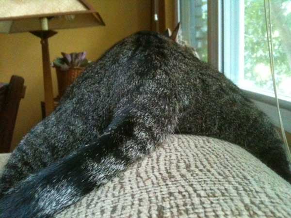Cathy B. says her mackerel tabby, Abby, lacks all modesty. And as for all these butt shots? “They seem to see it as a friendly gesture to flash it at us multiple times during the day,” she says.